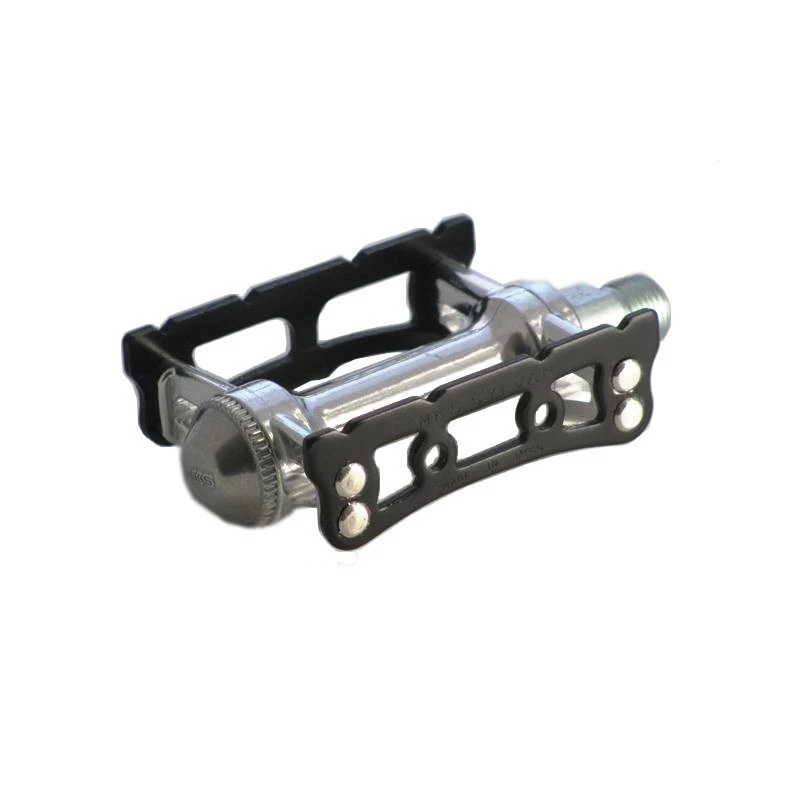 Les Pédales MKS Sylvan Track sont dotées d’une cage courte unilatérale en deux parties construite autour d’un corps de pédale compact qui permet une garde au sol suffisante dans les virages. La Sylvan Track est conçue pour être utilisée sur les pentes abruptes d’un vélodrome, mais est aussi à l’aise sur la route. Le profil des dents de la plaque de cage est presque lisse, nous recommandons donc des cale-pieds et des sangles avec cette pédale.