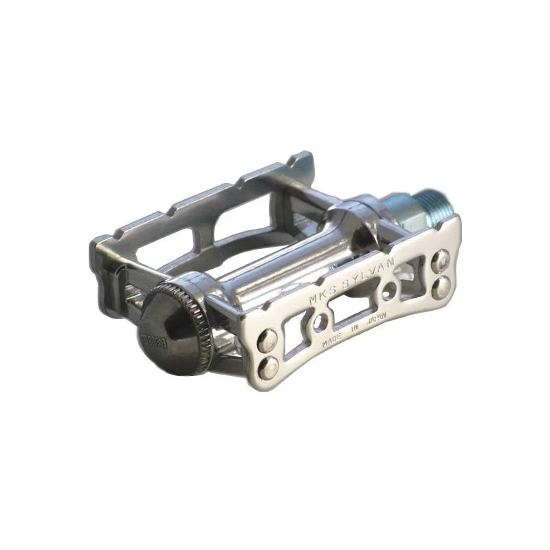Les Pédales MKS Sylvan Track sont dotées d’une cage courte unilatérale en deux parties construite autour d’un corps de pédale compact qui permet une garde au sol suffisante dans les virages. La Sylvan Track est conçue pour être utilisée sur les pentes abruptes d’un vélodrome, mais est aussi à l’aise sur la route. Le profil des dents de la plaque de cage est presque lisse, nous recommandons donc des cale-pieds et des sangles avec cette pédale.